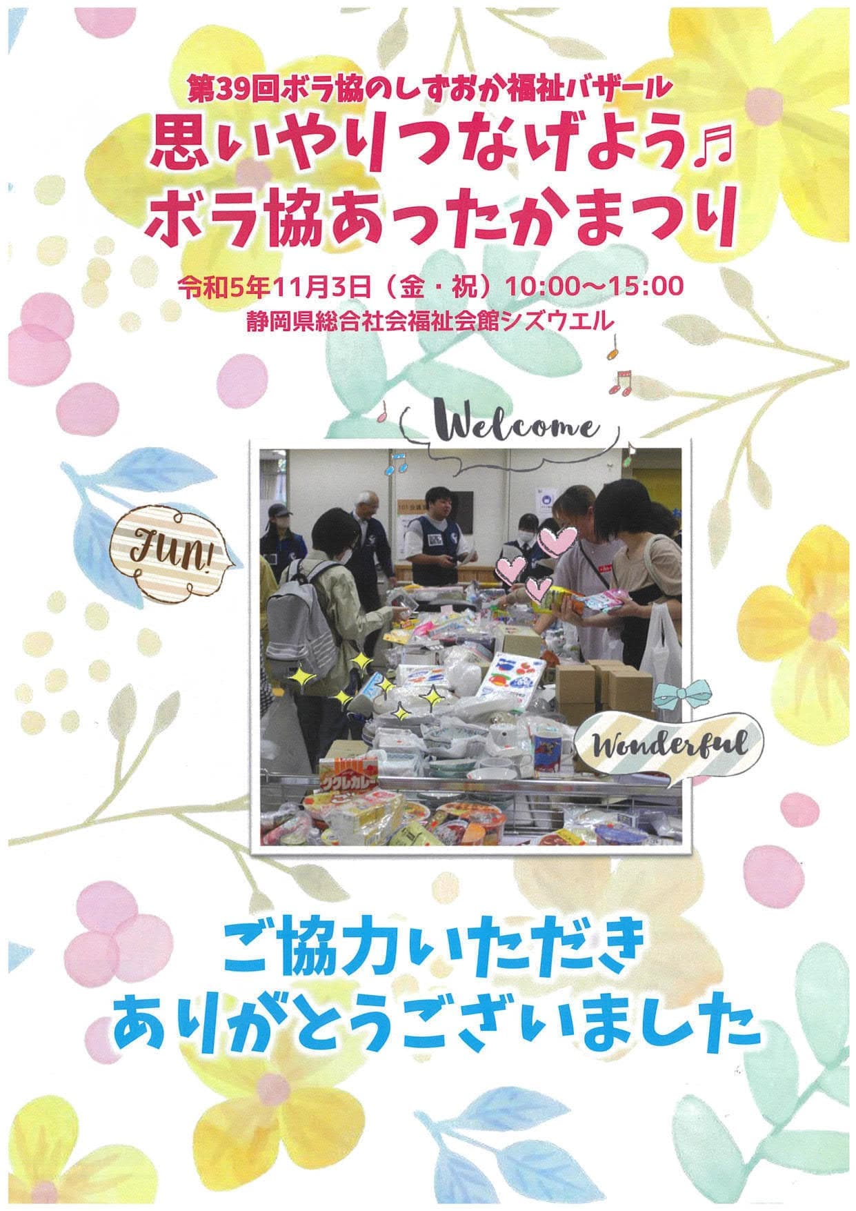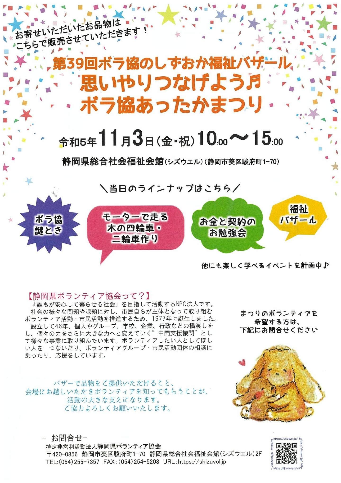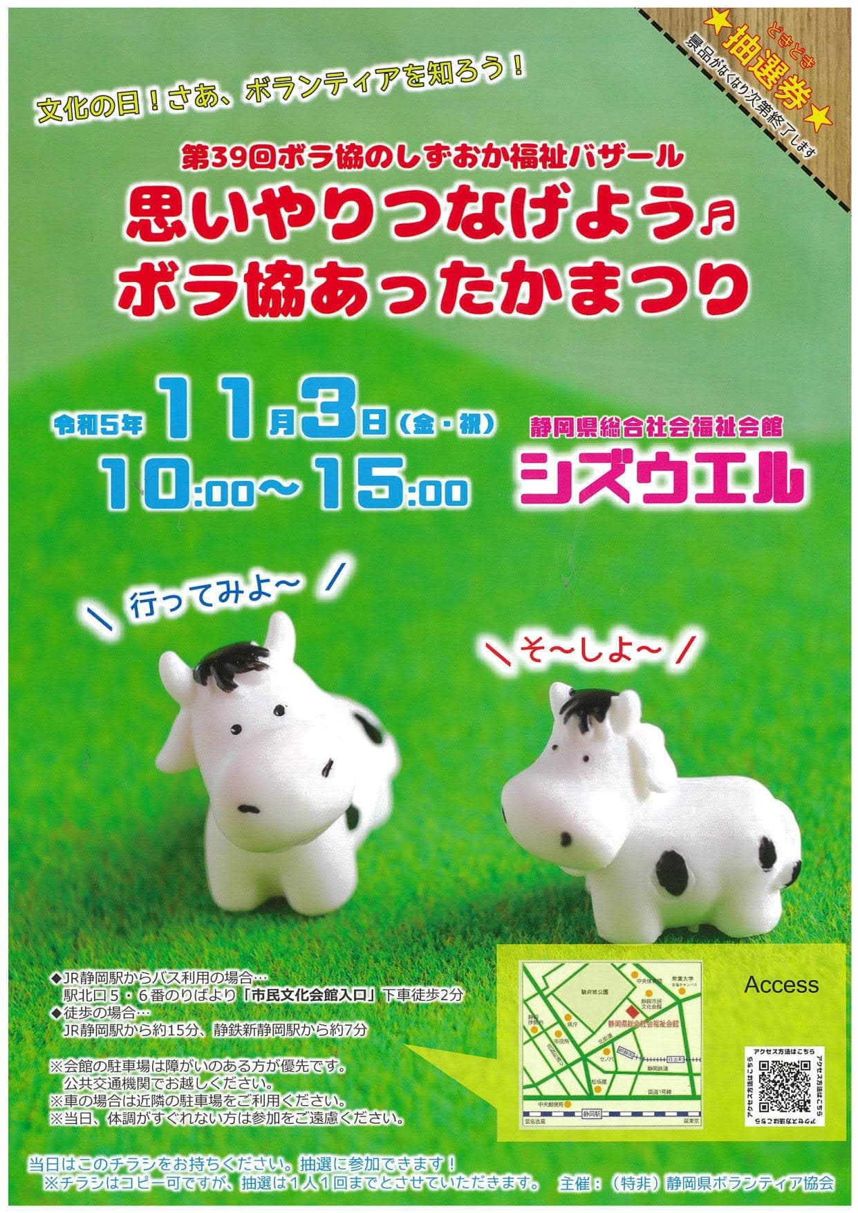 11月3日、静岡県ボランティア協会は、静岡県総合社会福祉会館(シズウエル)で「ボラ協の福祉バザール・思いやりつなげよう♬ボラ協あったかまつり」を開催します。
