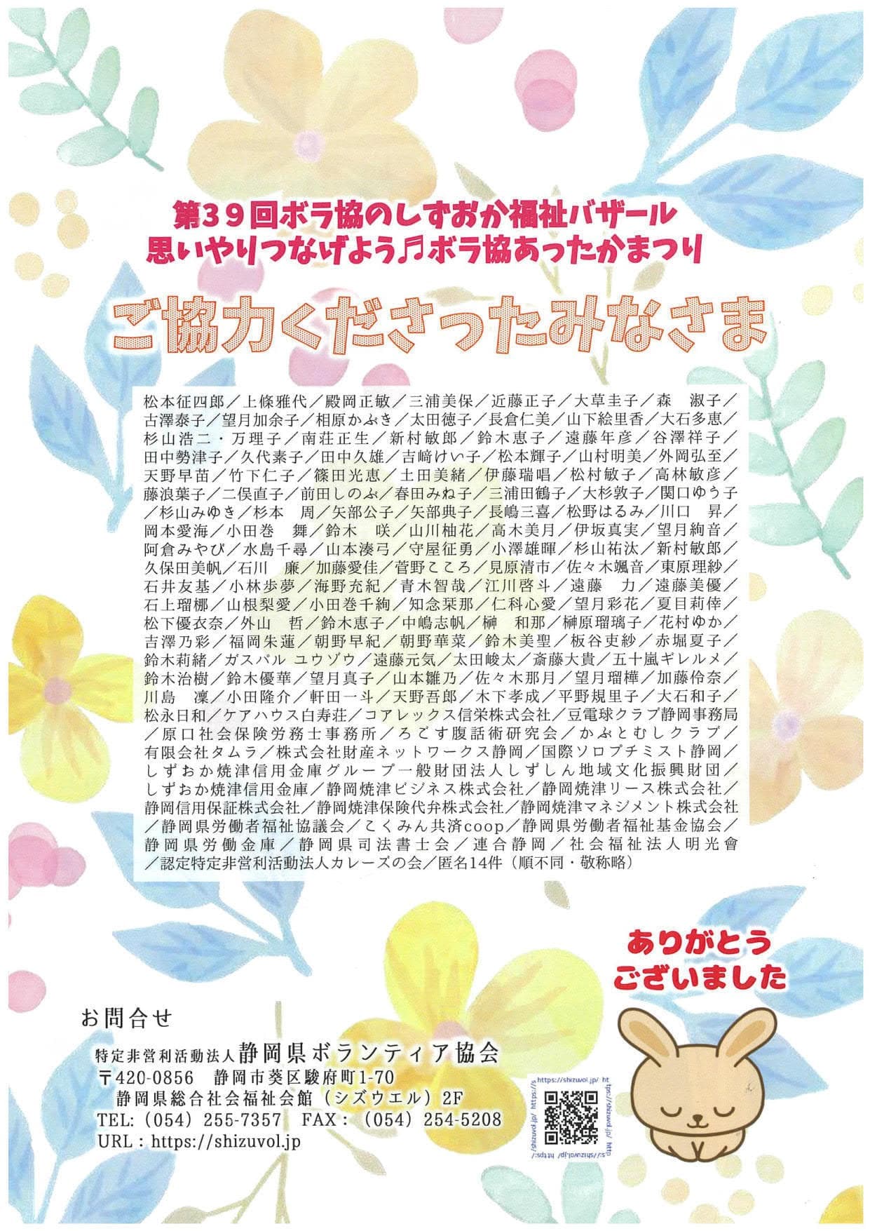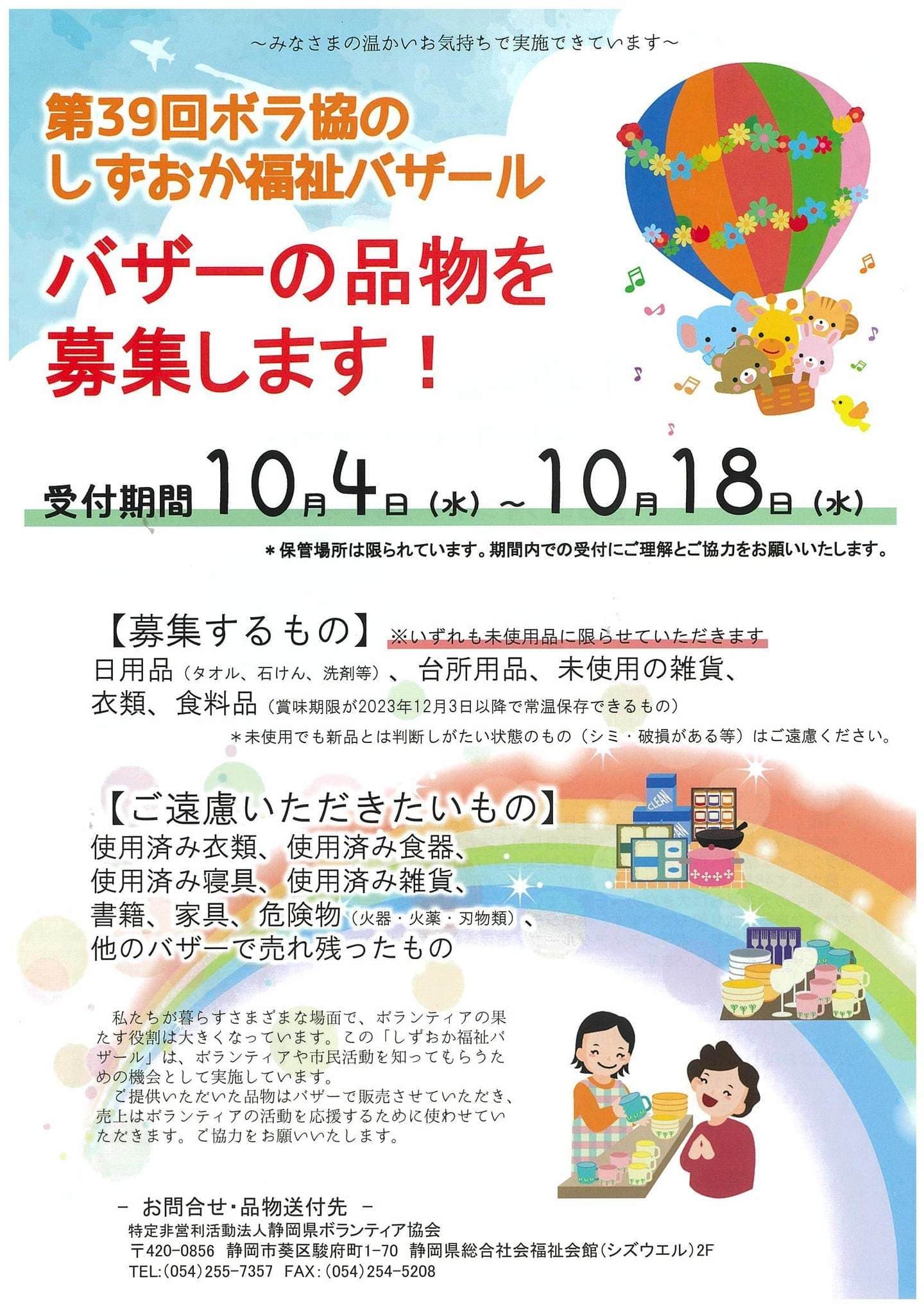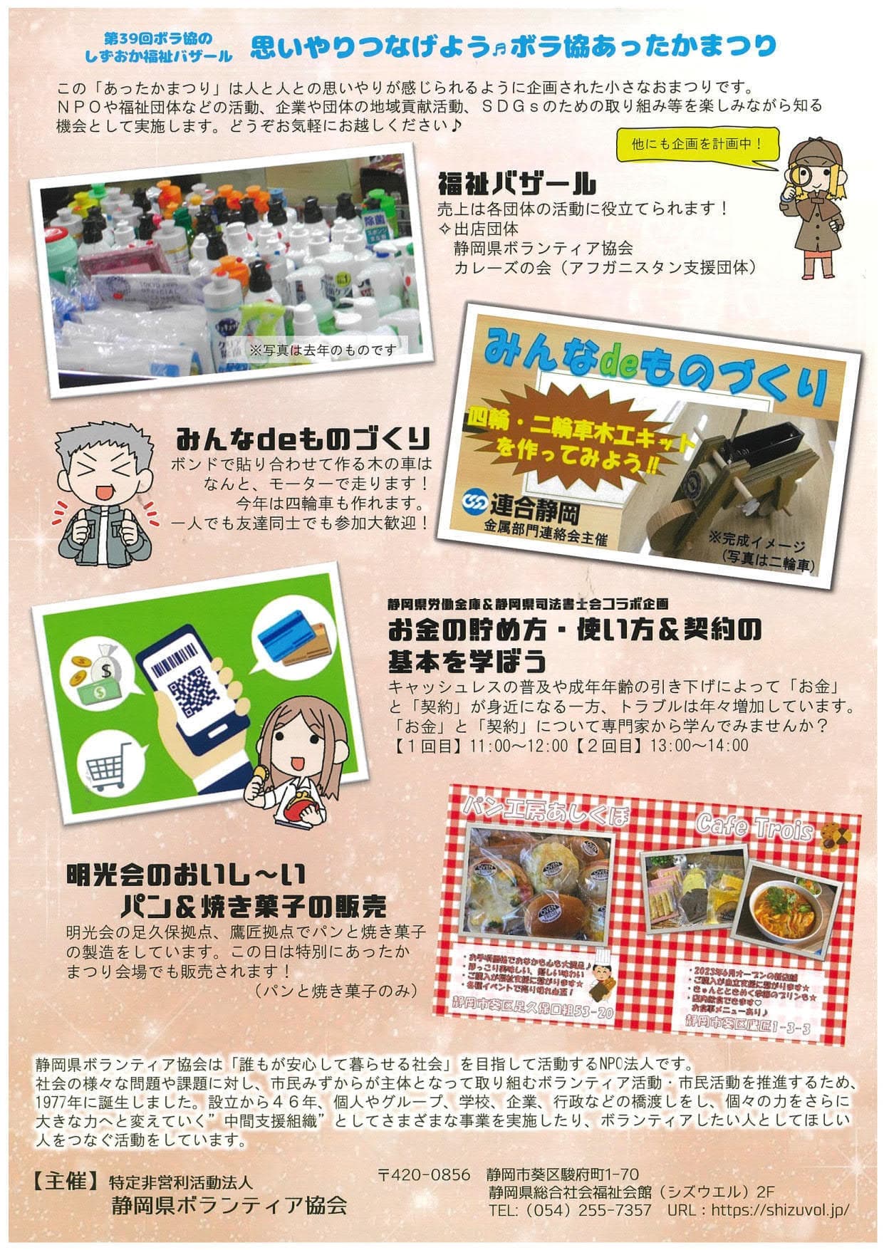 11月3日、静岡県ボランティア協会は、静岡県総合社会福祉会館(シズウエル)で「ボラ協の福祉バザール・思いやりつなげよう♬ボラ協あったかまつり」を開催します。