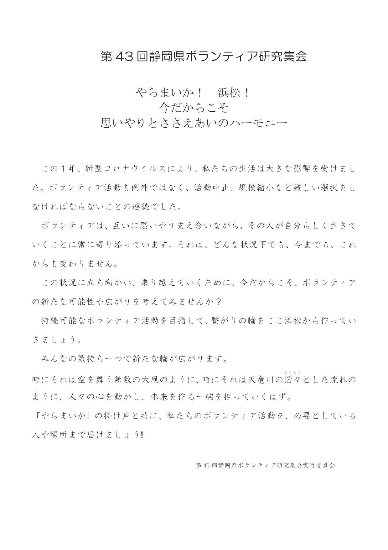 来年度に改めて第43回静岡県ボランティア研究集会として、浜松市において開催を致します。会場につきましては、浜松市福祉交流センターの改修工事が行われるため、変更となり会場を新たに選定いたしますが、それ以外は講師、助言者、事例提供者の皆さまにご都合をつけていただきご指導をいただく内容を考えております。甚だ簡単ではございますが、研究集会開催の延期につきまして決定させていただきましたことをご報告させていただきます。どうぞよろしくお願い致します。