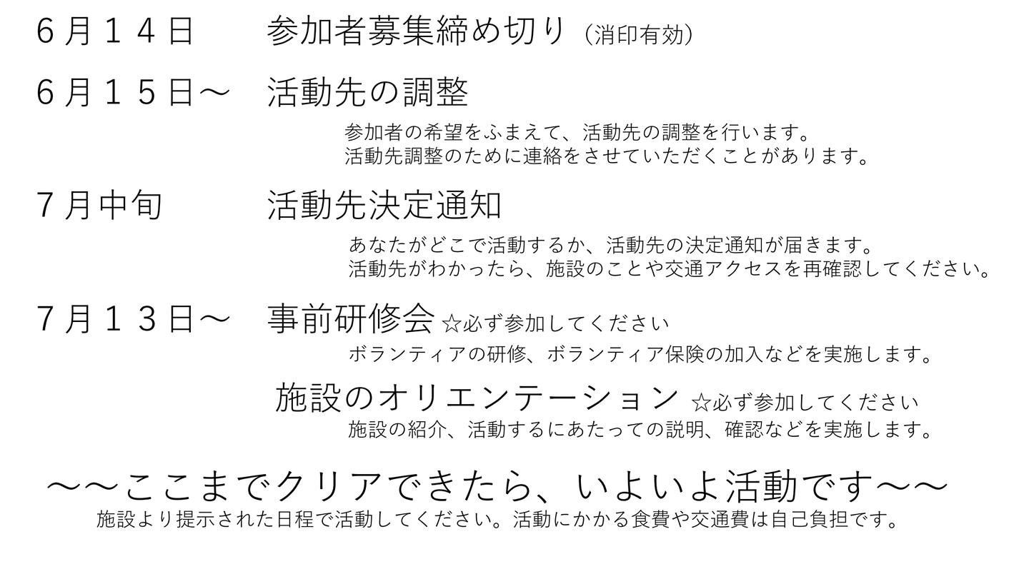 ①事前研修会、②施設のオリエンテーション、③実際の活動(活動期間の全日程)3つすべてに参加できること