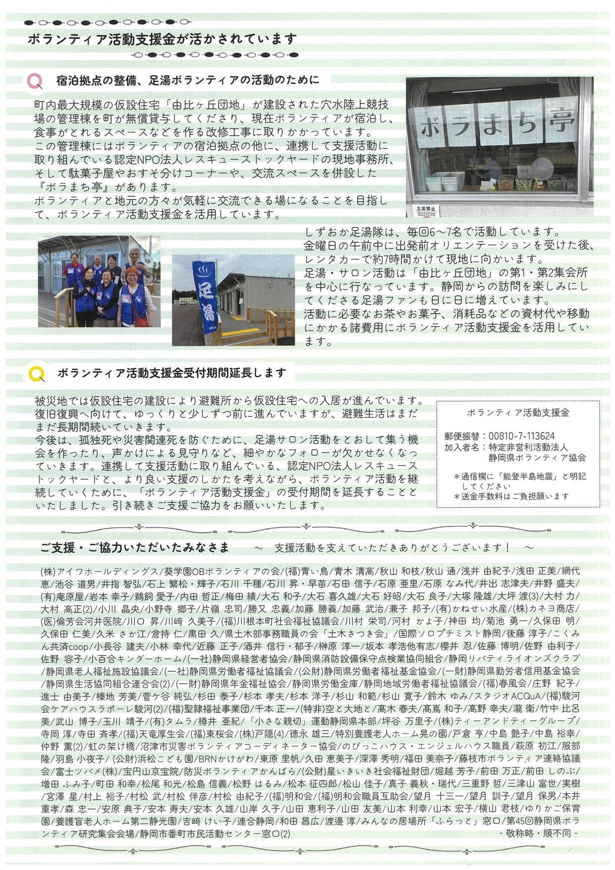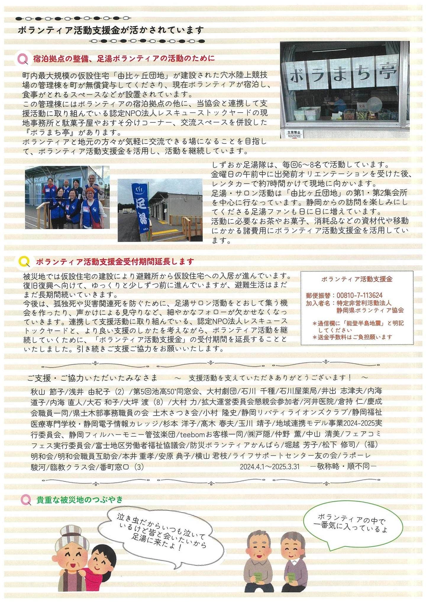 静岡県ボランティア協会では、穴水町内最大規模の仮設住宅「由比ヶ丘団地」を中心に、被災された方と1対1で向かい合い、なにげなくつぶやく言葉に耳を傾ける「足湯サロン活動」を4月26日からスタートしました。