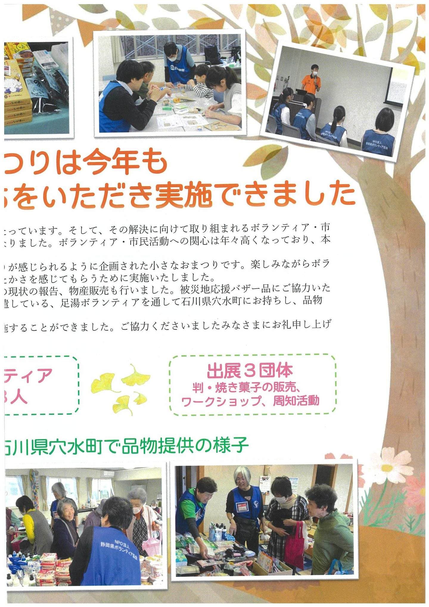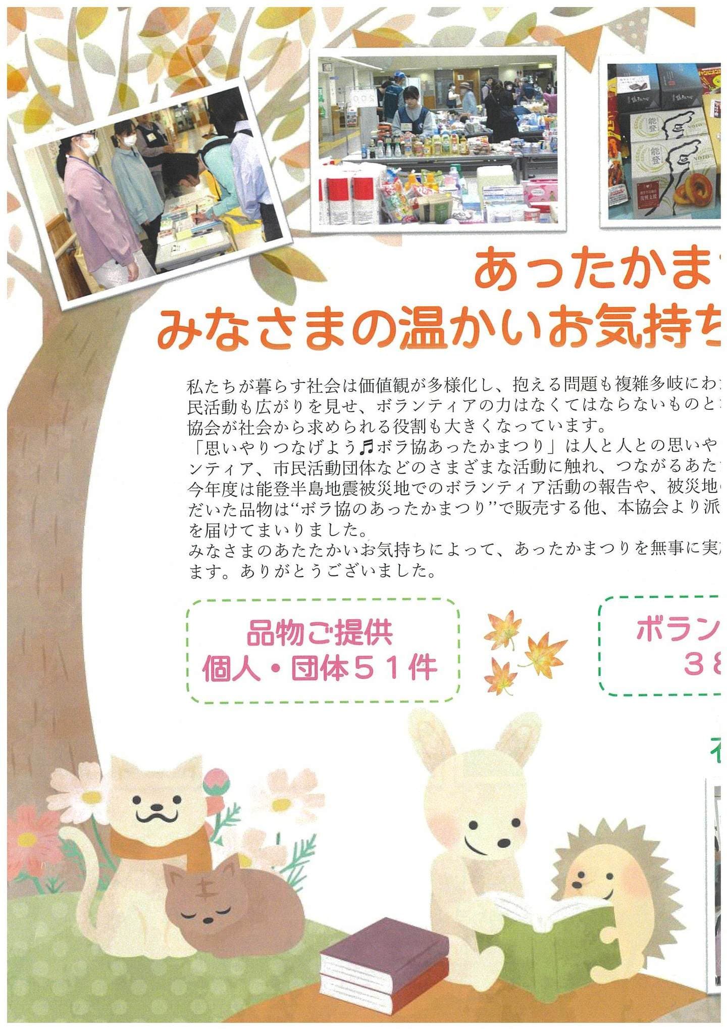 今年は、能登半島地震で被害を受けた方々を応援するために、「こんなものがあったら嬉しい」という声が多い品物を募集します。ご提供いただいた品物は、10月26日(土)に開催いたします「ボラ協あったかまつり」で販売するほか、石川県穴水町の被災された方々とボランティアの交流拠点「ボラまち亭」で活用させていただきます。
