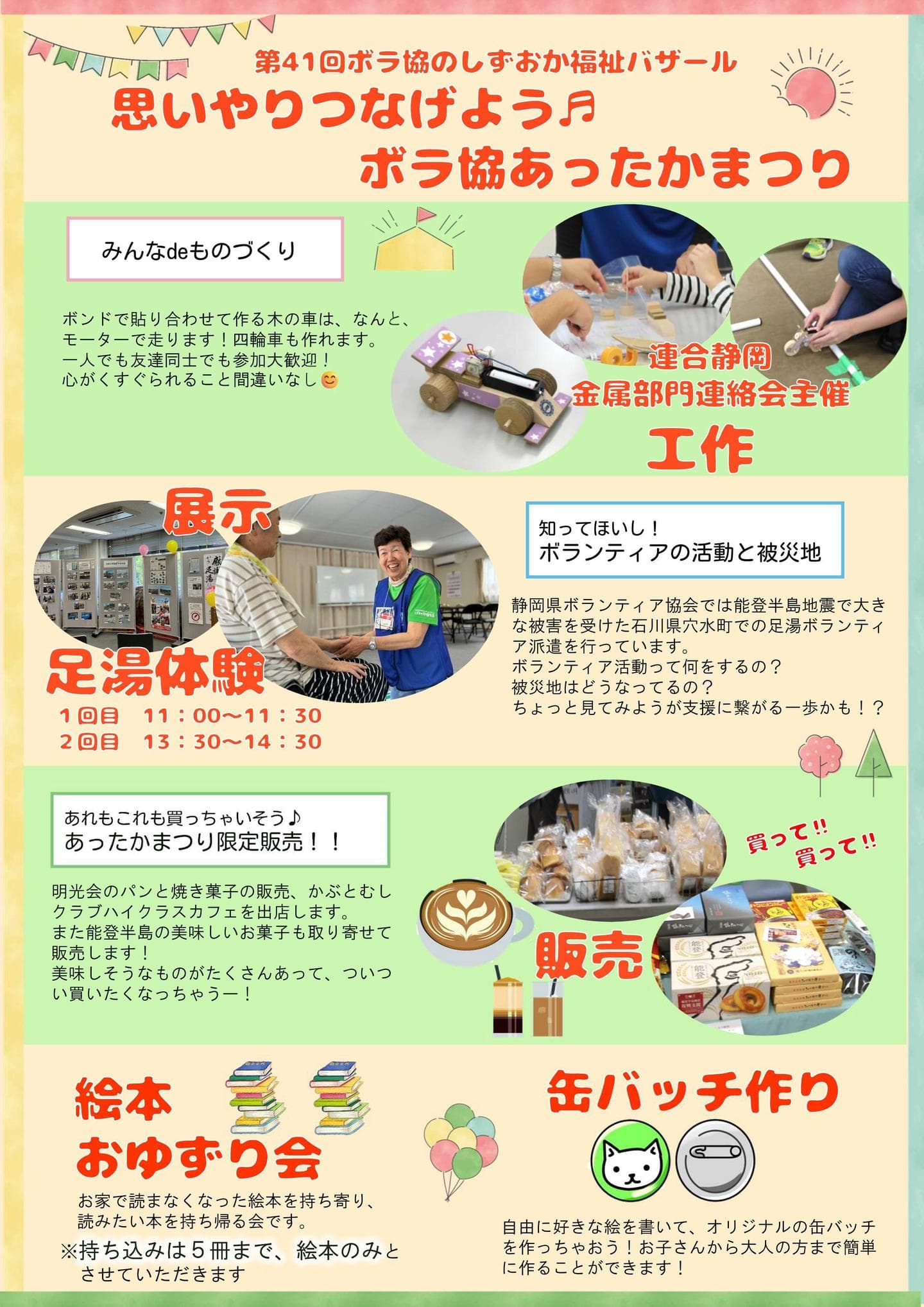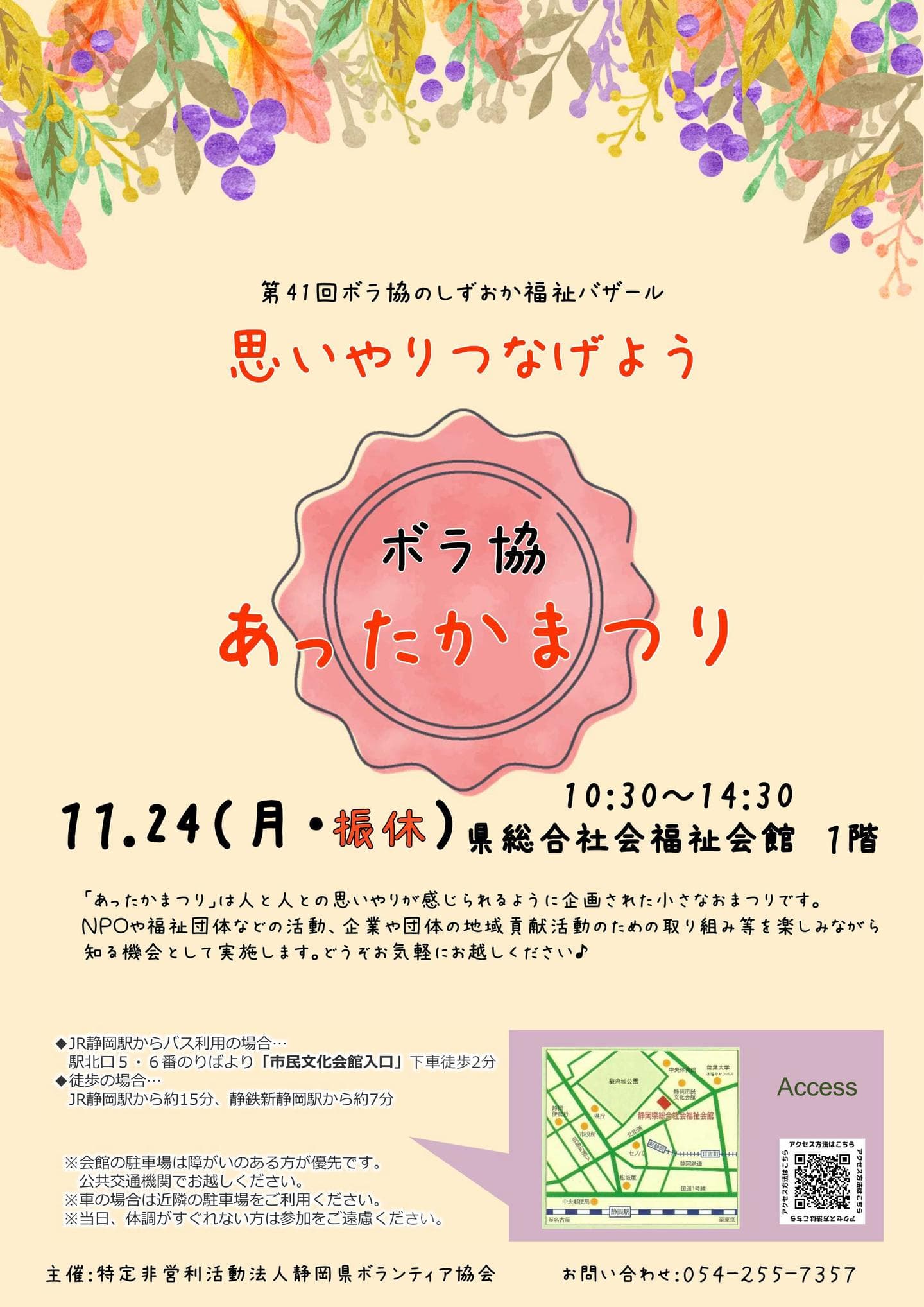 1.協会の紹介、 2.役員一覧、 3.理事長あいさつ、 4.事業報告PDF 5.会員になってください、 6.ご寄付のお願い、 7.所在地・アクセス、 8.定款 9.広報紙「ボランティア情報静岡」、 10.ボラ協の福祉バザール(あったかまつり) 11.ボランティアビューローの管理 12.切手こつこつボランティア 、 13.一本のジュース 、 14.ボランティアガイダンス ページトップへ