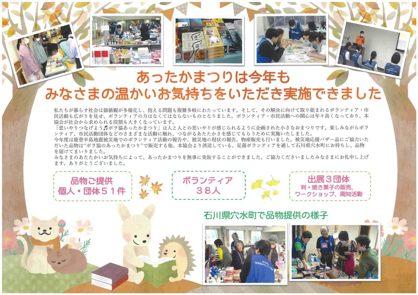 今年は、能登半島地震で被害を受けた方々を応援するために、「こんなものがあったら嬉しい」という声が多い品物を募集します。ご提供いただいた品物は、10月26日(土)に開催いたします「ボラ協あったかまつり」で販売するほか、石川県穴水町の被災された方々とボランティアの交流拠点「ボラまち亭」で活用させていただきます。