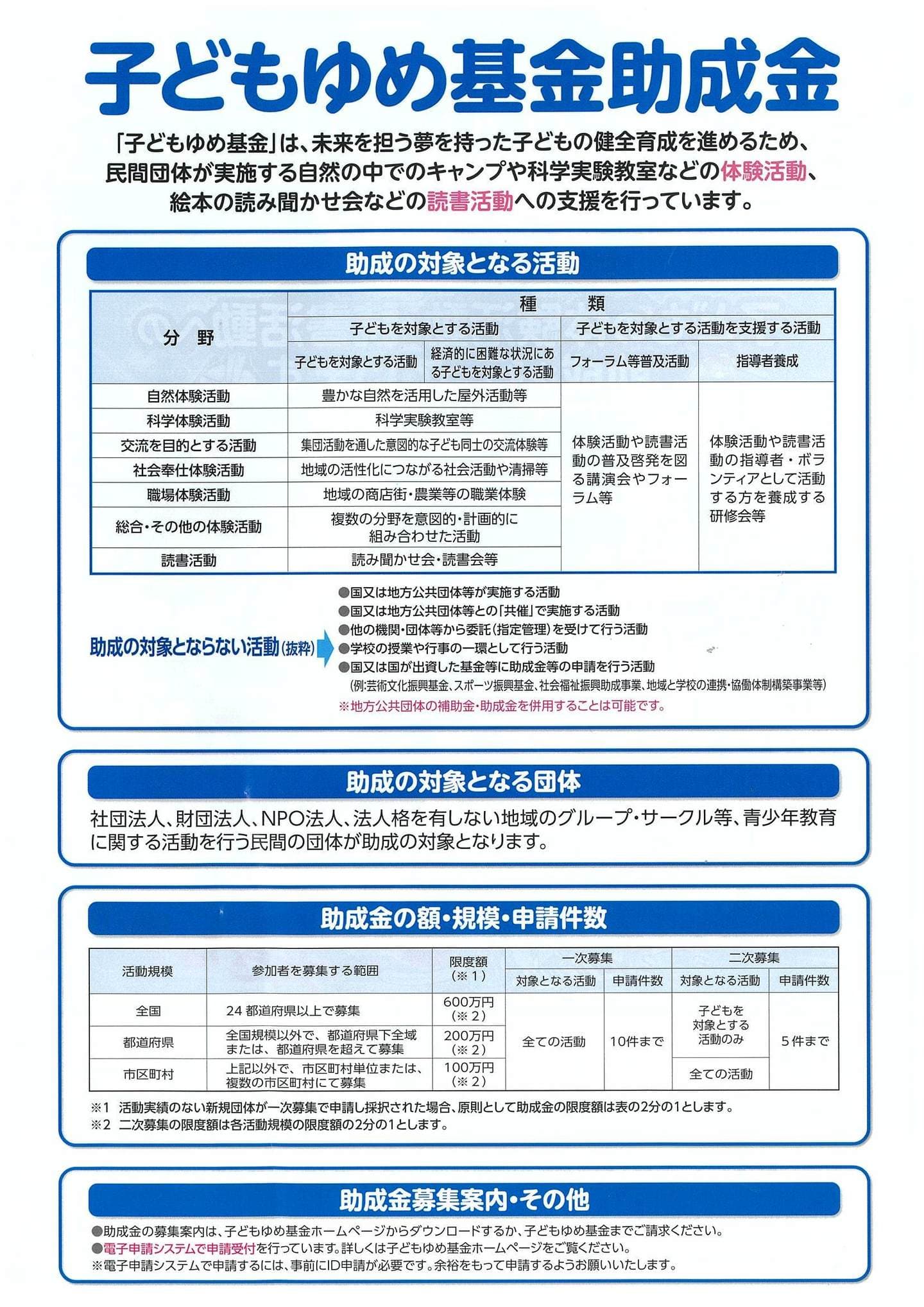 地域活動の一環として定期的・継続的に実施している子どもたちが行う自然体験・生活体験活動、仲間づくりや文化の伝承活動、地域の子育て支援活動に対して都道府県知事のご推薦に基づき助成