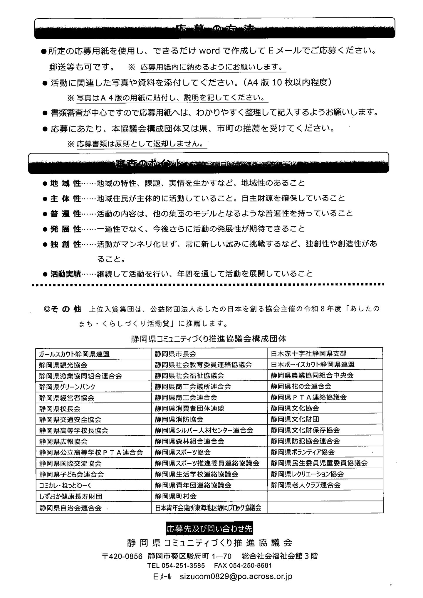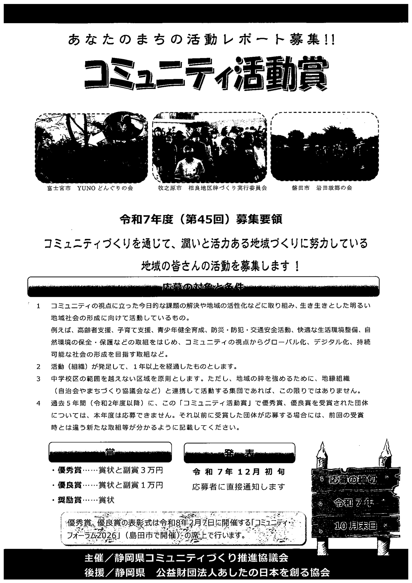 コミュニティづくりを通じて、潤いと活力のある地域づくりに努力している地域の皆さんの活動を募集