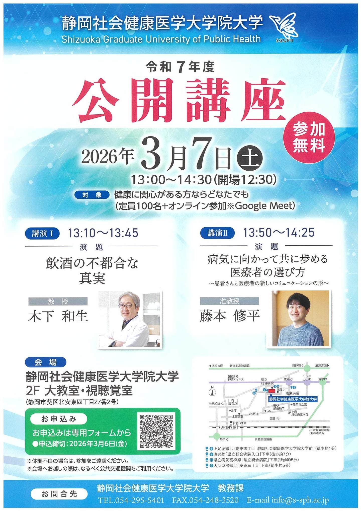 日程:3月7日(土) 13:00~14:30 静岡健康医学大学院大学2F 大教室・視聴覚室