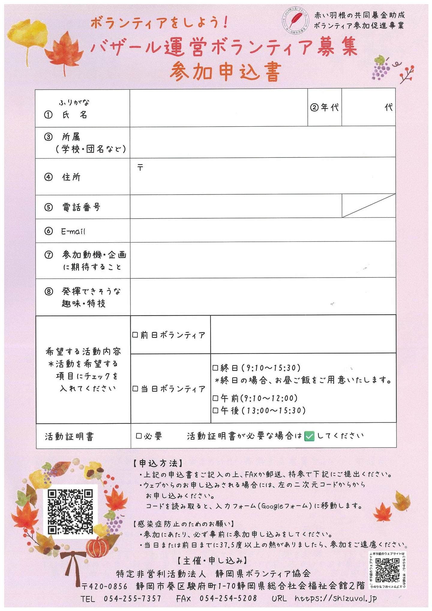 | 問合わせ | 静岡県ボランティア協会 TEL:054-255-7357 FAX:054-254-5208 |