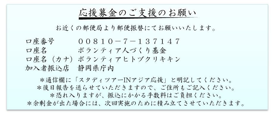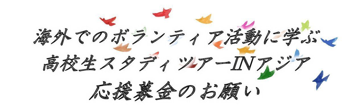 つきましては、みなさまからのご支援を賜りたく、「高校生スタディツアーINアジア応援募金」としてご支援の呼びかけをさせていただきます。