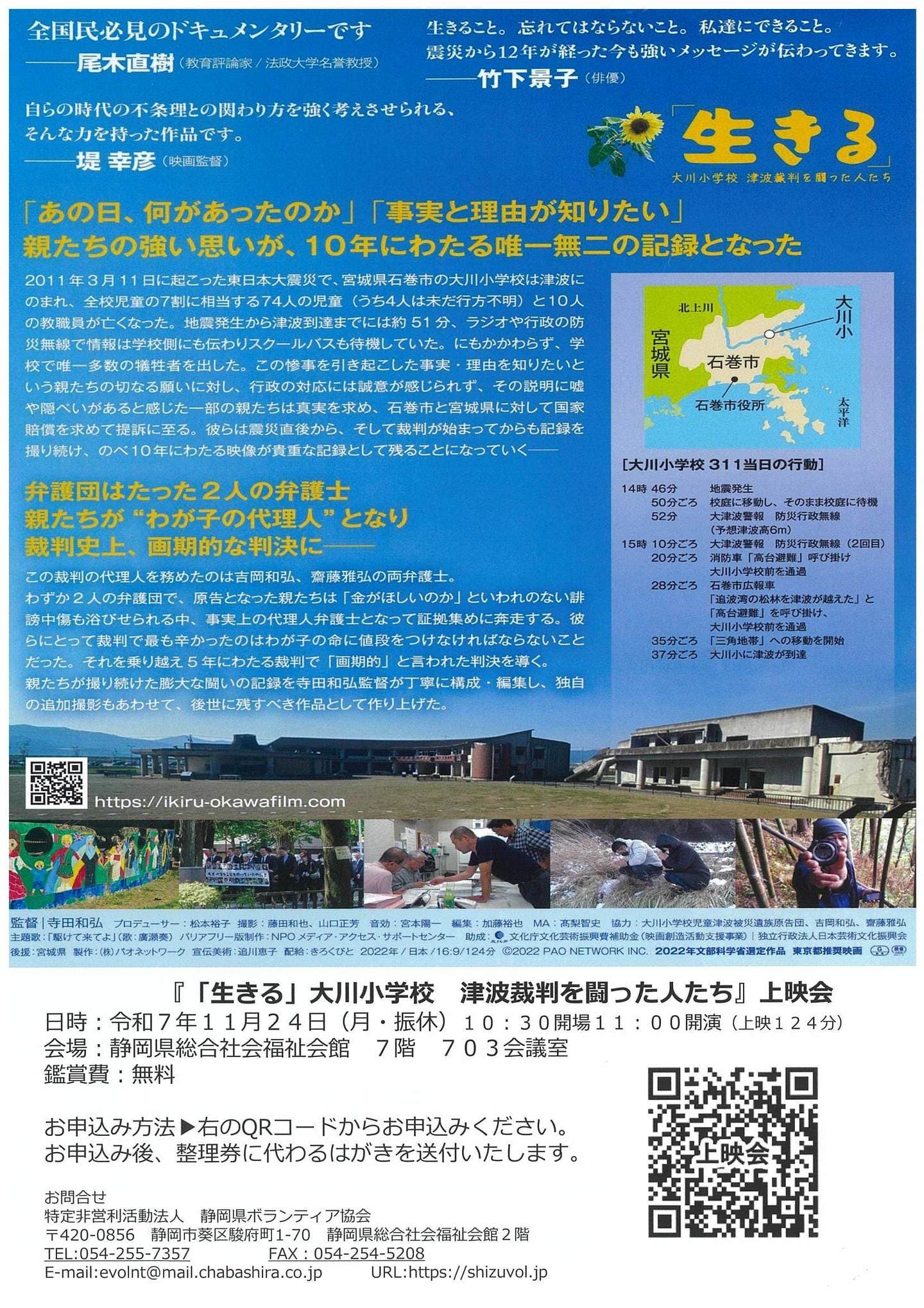 WEB申込フォーム→ 上映会申し込み 【お申込み・問合せ】 特定非営利活動法人静岡県ボランティア協会〒420-0856静岡市葵区駿府町1-70静岡県総合社会福祉会館2階TEL:054-255-7357/FAX:054-254-5208URL:https://www.shizuvol.jp ページトップへ